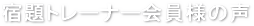 仕事で、朝から夜まで仕事で運動から離れていました。それからの事、肩こりがひどくなり、毎日が辛いのが当たり前でした。そんな時、友人の紹介でホームトレーナーに登録してみました。宿題が月の始めに送られてくるので、良い意味で管理されて、(宿題)の良いプレッシャーの中、毎日行えています。自分自身を管理、指摘してくれるトレーナーって必要と感じました。